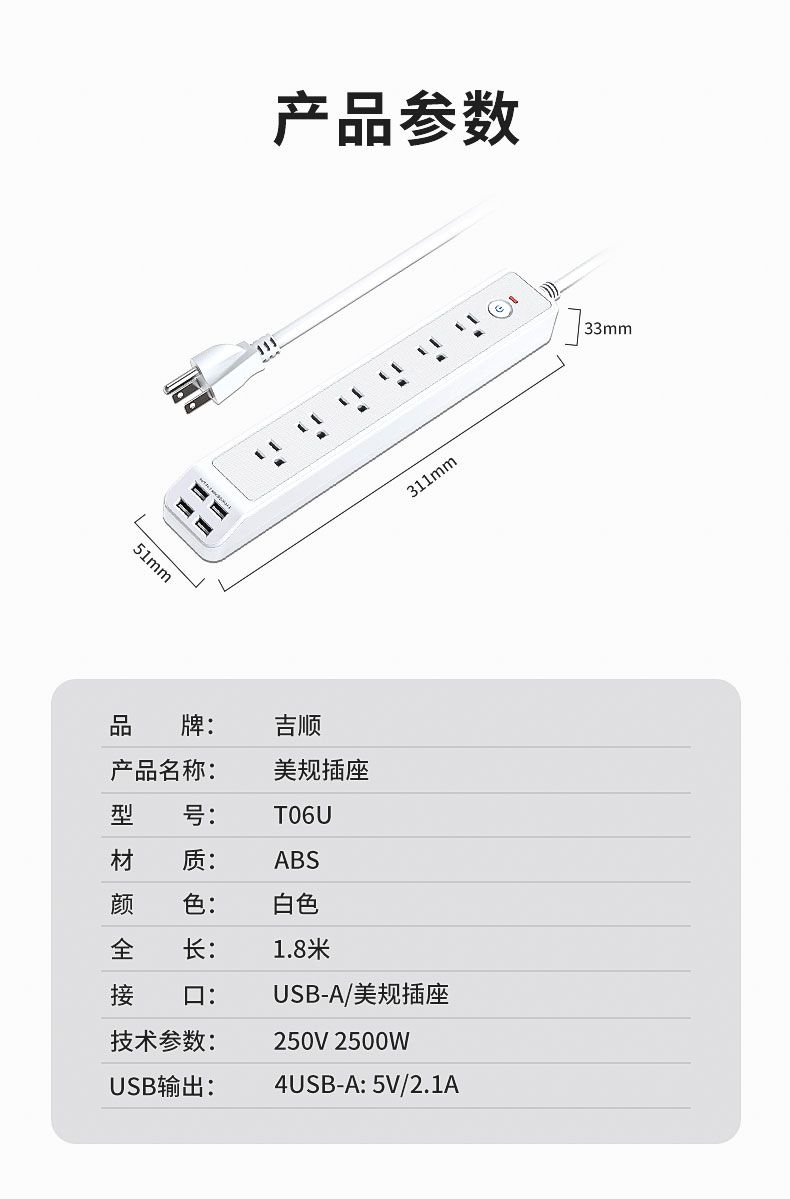 现货-美规6位排插,带4USB,1.8M线,总控开关,过载保护,500个起支持OEM/ODM